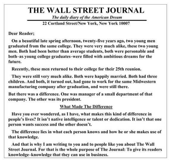 Storytelling matters in sales, whether you're trying to get a meeting or aiming to close a deal. It matters, whether you're sitting across the desk of a prospect or pressing "send" on a cold email.Here's an example of the most successful sales letter in history and how it uses storytelling to connect with prospective subscribers of The Wall Street Journal.