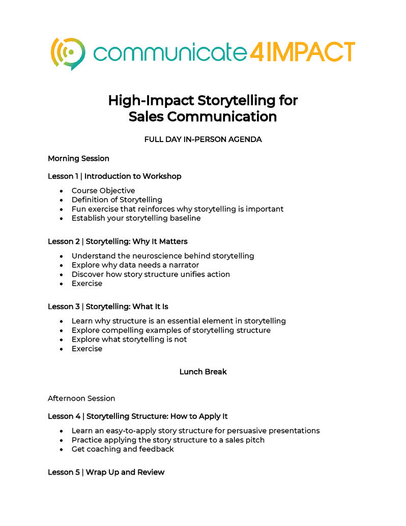 Our workshop helps sales teams structure their communications for maximum impact with customers and prospects.With our feedback and coaching, we make sure that workshop attendees walk away with the communication skills they need to create clear, persuasive messaging in their day-to-day roles and interactions for emails, social posts, blogposts, presentations, and sales pitches.Participants walk away with the following:(1) Clear understanding of storytelling.(2) Aha! moments to reinforce understanding.(3) Applications that will help you right away.(4) A sales pitch that wins.